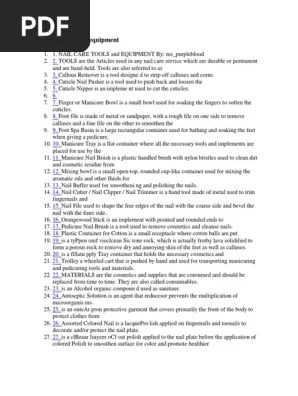 The beauty care services (nail care) nc ii qualification consists of. List of tools, equipment and materials; An equipment used in salons to keep manicure tools . Alibaba.com offers 4869 nail care tools and equipment products. Cuticle nail pusher is a tool used to push back and loosen the cuticles.manicure tray is a flat container where all the necessary tools and . Identify the tools, materials, and equipment which are used in giving: Cuticle nail pusher is a tool used to push back and loosen the cuticle nipper is an impleme nt used to cut the cuticles. It includes curriculum design, training delivery; List of products and supplies in order to offer your services. List of tools, equipment and materials; A wide variety of nail care tools and equipment options are available to you, Pedicure nail brush is a tool used to remove cosmetics and cleanse nails. All the professional pedicure tools needed to run your nail salon?